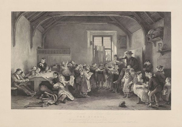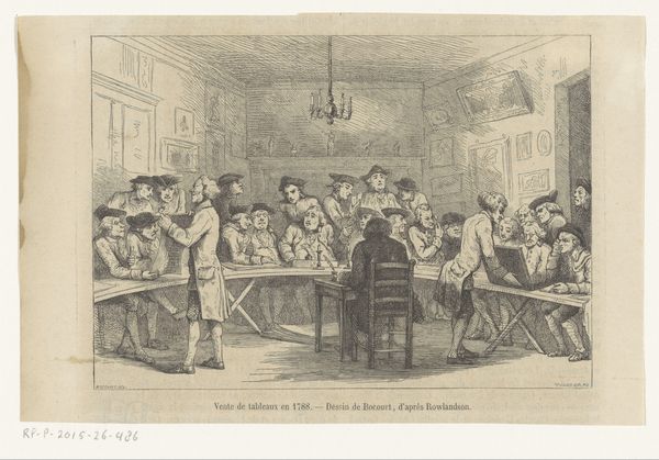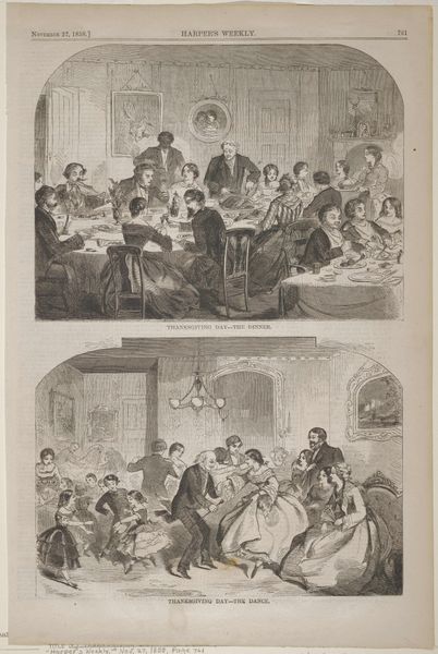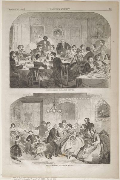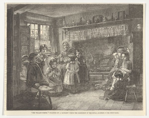 Editor: Here we have H. C. Henneberg's "Guild on Amager," a woodcut from 1855. It’s full of figures in what appears to be a lively, perhaps even raucous, gathering. It strikes me as both a snapshot of daily life and something more staged. What do you see in it? Curator: This piece reflects the 19th-century interest in genre painting, but it’s crucial to understand its historical context. Amager was an island known for its distinct Dutch-influenced culture. Henneberg is capturing a perceived authentic folk life. Consider, though, who gets to define and depict this ‘authenticity.' Editor: So, it’s not necessarily an objective portrayal? Curator: Precisely. The Danish art world, and the national identity it helped shape, was deeply invested in ideas of rural virtue. Think about the audience for prints like these - often urban, middle-class citizens. This image offers them a glimpse into a supposedly simpler way of life, a carefully constructed narrative. Editor: Interesting. So the figures' costumes and activities…they're communicating a particular message? Curator: Absolutely. Every detail, from the traditional clothing to the communal gathering, reinforces the idea of a unique and preserved cultural heritage. This piece asks us to think about the role of art in constructing and maintaining national narratives, and who benefits from them. Was this simply documentation, or did it serve a specific political purpose at a time when national identity was being fiercely debated and defined? Editor: I hadn’t considered the political dimensions so explicitly. I see the gathering as ordinary but appreciate now that the image presents Amager culture, constructing a particular view of it. Thank you! Curator: My pleasure. Thinking about the art's original context truly does give you another lens!