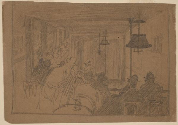 Editor: So, this is George Wiggins's "Prohibition," a print made with pencil and charcoal, created around 1930. There's a lot going on, but I’m immediately struck by how… claustrophobic it feels, yet full of illicit joy. The composition, with all those shadowy figures crammed into what looks like a speakeasy, really evokes that sense of furtive excitement. What do you make of it? Curator: You know, I feel that 'hush-hush' energy radiating right off it. Like you've stumbled into a secret only revealed after whispering the password. See how Wiggins plays with light and shadow? The glow of the lamp, the faces emerging from the gloom… it’s like capturing stolen moments. What kind of story do you think these furtive arrangements tell? Editor: Definitely a story about defiance. You know, flouting the rules. Do you think he’s romanticizing this illegal behaviour, or is there a critical perspective too? Curator: That’s the artist's clever dance, isn't it? Wiggins isn't just presenting a party scene; he’s winking at the absurdity of the whole Prohibition era. There’s a liveliness, but also an underlying… melancholy? Knowing these soirees happened in defiance of a nationwide ban lends a certain gravitas to these otherwise jolly people. It prompts you to consider what else might lie beneath the surface. It really calls for looking more carefully to uncover all of the implications behind those revels. Don't you think? Editor: I do, and the title is pretty telling too! It's made me rethink how artists use everyday settings to communicate something deeper. Curator: Absolutely, Wiggins masterfully transforms what might seem like a common, 'speakeasy' setting into a profound commentary. A reflection of a very rebellious historical mood through careful composition and a delicate treatment of materials. What a world.