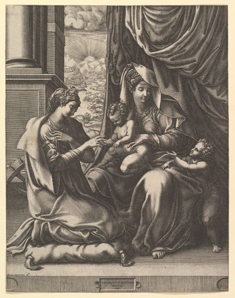 "Autre imitation: L'amour mouille" is an engraving by an anonymous artist. It depicts a scene reminiscent of classical antiquity. But who were the intended viewers of this image, and what cultural values did it reflect? The artwork shows a bearded man, possibly a patriarch, with Cupid. This intimate portrayal prompts us to consider the dynamics of power and affection within historical contexts. Is it a celebration of youthful innocence, or does it hint at more complex relationships? The title itself, which translates to "Another imitation: Love wets," is intriguing. Is this suggesting a copy, or a commentary on the nature of love itself? The setting, adorned with classical motifs, underscores the era's fascination with antiquity. Yet, the ambiguity of the artist's identity and the title leave room to question traditional interpretations. This engraving invites us to reflect on how love, desire, and power were perceived and represented, and perhaps, challenges us to reconsider our contemporary understandings.