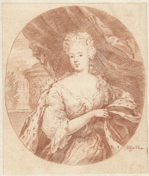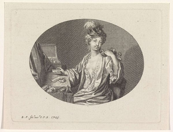 This etching, titled 'Man betaalt een vrouw' or 'Man pays a woman', was created by an anonymous artist. During this time, the Dutch Republic was experiencing immense economic growth. This print offers a glimpse into the negotiation of gender and class within the burgeoning commercial culture. We see a transaction occurring, symbolized by the coins being exchanged, suggesting a commentary on social interactions reduced to monetary exchanges. The woman's gaze doesn't meet the man's; she looks off to the side, perhaps reflecting a sense of detachment, or maybe hinting at the complex power dynamics at play. There’s a vulnerability in the way she's depicted, seated with partially exposed chest, versus the man’s covered and ornate presentation. The inclusion of musical instruments in the background is interesting. Are they symbolic of harmony or discord in this exchange? It’s up for you to decide. It leaves us questioning the emotional and ethical dimensions of the depicted scene.