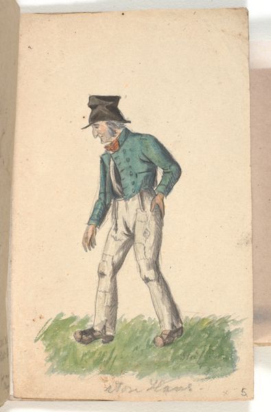 Curator: Immediately I’m drawn to the humility of this piece, this depiction of a man so plainly rendered. It speaks to a certain starkness, a realness. Editor: Here we have P.C. Skovgaard’s “En mand på bare fødder med en pose under armen og en stav i hånden," created sometime between 1826 and 1829. The title translates to "A man on bare feet with a bag under his arm and a staff in his hand". Skovgaard employed colored pencils and watercolors for this drawing, which currently resides at the SMK, the National Gallery of Denmark. Curator: There’s something compelling in the simplicity of his attire, juxtaposed with what appears to be a distinct weariness etched into his face. It invites a discussion around class and the visibility, or lack thereof, of the working class in art during that period. How does it intersect with representations of poverty and labor? Editor: Precisely. We have to contextualize this within the Romantic movement, understanding Skovgaard’s artistic choices in relation to the socio-political climate. He seems less interested in idealization and more concerned with representing an unvarnished truth about Danish rural life. Was this to invoke sympathy? Social reform? Curator: It might be too simple to assume any singular motivation. I see threads of feminist theory at play as well – examining the gaze through which this man is portrayed, how it shapes our understanding of his humanity. The artwork does, to some extent, encourage that kind of intersectional understanding. Editor: And it brings up questions about how artistic institutions shape what we value historically, who is seen and unseen, how art itself might play into the normalization or critique of certain social structures. This drawing feels deceptively simple, when it opens into many paths for socio-political understanding. Curator: Yes, and perhaps its quiet power lies in its very restraint. Thank you, a perspective both broadening and yet somehow focusing my awareness. Editor: Likewise. There’s a lot to think about regarding the cultural forces operating even within what seems like a straightforward sketch.