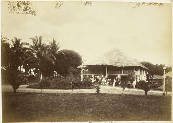 Editor: This photograph, entitled "Brussel - Kolonisatiewoning. Links Eucalyptus, rechts ananas, pisang, djagoen," dates from sometime between 1937 and 1939. It’s a gelatin-silver print. It depicts what appears to be a simple dwelling surrounded by lush vegetation, and I can't help but wonder what life was like for the people who lived there. What stands out to you in this piece? Curator: This image immediately speaks to the power dynamics inherent in colonial photography. The title itself, "Kolonisatiewoning," or "Colonization House," frames the image within a specific socio-political context. We're not simply viewing a house; we’re viewing a symbol of colonial presence. Note the way the exoticized flora, pointed out in the inscription—Eucalyptus, pineapple, banana, sorghum—visually asserts control over the landscape and, by extension, its inhabitants. Editor: So the photograph isn't just a neutral document but rather a constructed representation of colonial ideology? Curator: Precisely. Think about who commissioned or took this photograph and for what purpose. Was it intended to promote the success of colonial projects? To document a specific type of housing? The composition, with the house centered and framed by "exotic" plants, likely served to reinforce a particular narrative for a European audience. How do you perceive the presence and arrangement of the people in the foreground? Editor: They seem almost incidental, like props. They certainly aren't the focus, and they are literally sitting low. Curator: Exactly. They are there, but not centered or even acknowledged. The colonisation house itself is given far more focus. The presence of the children also evokes considerations about their future and how that future is shaped by colonisation. It is a very carefully orchestrated image of power and subjugation. Editor: I never considered how seemingly objective photography could be so loaded with cultural and political meaning. It really changes how I see historical images. Curator: Indeed. This photograph invites us to critically examine the role of imagery in perpetuating colonial narratives and to consider the voices and perspectives that are often silenced or marginalized in these visual representations.