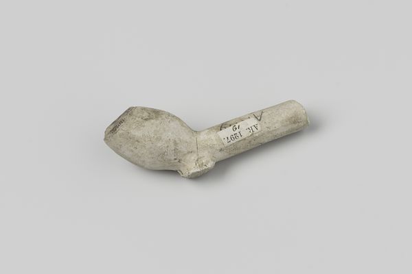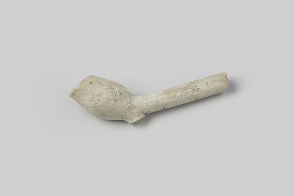 Curator: What we're looking at is a humble object: a fragment of a tobacco pipe. It's estimated to have been made sometime between 1670 and 1700, author remains anonymous, but it speaks volumes about its time. Editor: My first thought? Loneliness. It's a relic, broken, sitting there on the plain backdrop like it's waiting for its other half. Gives off this muted, ghostly vibe, doesn't it? And the surface? Kind of battered and used... Curator: Precisely. Tobacco use became quite widespread throughout Europe during this period. Its presence in daily life certainly changed social rituals. The rise of tobacco coincided with major political shifts – increased trade, colonialism, the development of new economies... Editor: It’s funny, isn’t it? This small object once played a role in grand narratives, trade, politics, revolutions. I see those tiny indentations, probably decorative, as remnants of conversations. Maybe plotting new world domination. Or maybe just chatting with the neighbor about the price of tulips... Curator: Consider where something like this might have been found: archeological dig sites in former colonial outposts for instance. These objects are invaluable cultural artifacts that help tell stories of both personal habit and global exchange. Its fractured nature only enriches that narrative. What story does it no longer tell? What secrets are lost with its missing pieces? Editor: You know, holding something like this, imagining who might have smoked it, it kind of collapses time. The residue of someone else's experience is clinging there, waiting to ignite in your mind! A puff of history. Curator: Exactly. It’s a reminder of how deeply intertwined personal habits are with much larger cultural movements. And also how even the most everyday object carries significant cultural weight. Editor: Right. And how something broken can hold more meaning, spark more curiosity, than something whole. This little pipe fragment? It’s a tiny key unlocking a much larger history. Curator: Indeed. Editor: A satisfying smoke signal from the past.