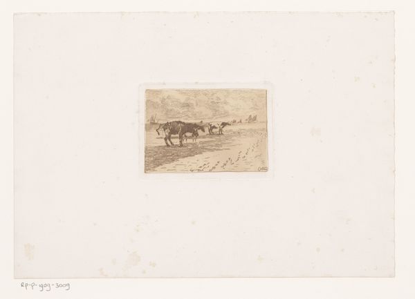 Curator: This is Armand Collard’s "Four Donkeys on the Beach," likely created between 1848 and 1909. It's an etching, a print, created with ink on paper. Editor: Well, it’s bleak, isn’t it? Those poor donkeys, they look so dejected. The whole scene feels… windswept and melancholic, somehow. Curator: The choice of realism places them starkly in their environment. Donkeys in art often reflect ideas of burden, labor, and the working class. And of course, the beach as a site carries its own social and historical baggage, particularly concerning labor and leisure. Editor: Burden, yes, that’s it! You can almost feel the weight they carry, emotional or physical, maybe both! I keep thinking, are they longing to be anywhere else? Is that tiny sailboat on the horizon mocking them? Curator: Their stillness juxtaposed against the potential for movement is key. It asks questions about their social positioning and limited agency. Also, note the almost equal emphasis on the landscape and the animals. This speaks to humanity’s intertwined relationship with the natural world and how we’ve historically extracted labor from it. Editor: Ah, so not just a charming pastoral scene, then? I can see that, especially the way the artist captured them in such simple lines. The light and shadow emphasize their weariness but still conveys a sense of dignity. It makes you wonder about the socioeconomic dynamics at play here! Who owned these donkeys? What was their purpose? Curator: Exactly! And this seemingly simple scene of labor carries complex layers about social hierarchies and even animal rights issues in how they interact within systems of exploitation. Editor: Food for thought for our day at the beach, huh? I will never look at donkeys quite the same way again. The subtle social commentary slipped in there is simply astonishing. Curator: Precisely. Hopefully, reflecting on this will empower new avenues for critical engagement with art history itself.