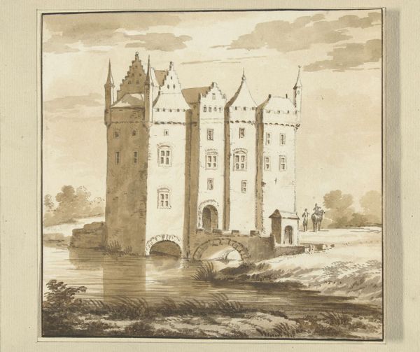Abraham de Haen the Younger created this drawing of Slot Abtspoel near Oegstgeest with pen in grey ink and grey wash. Castles in the Netherlands were not just military structures but also symbols of status and power. During the 18th century, as the Dutch Republic experienced a period of relative peace, the military function of these castles diminished. Instead, they became country estates for the wealthy elite. De Haen's drawing, with its serene depiction of the castle and its surroundings, reflects this shift. The lone fisherman on the bridge suggests a life of leisure and contemplation, far removed from the battles of previous centuries. The symmetrical composition and careful rendering of details speak to the artistic conventions of the time. Understanding this artwork requires looking at estate records, family papers, and other historical documents to reconstruct the world in which it was created.