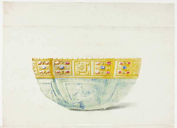 Editor: Here we have an undated piece entitled "Decorative Bowl," rendered in gouache, watercolor, chalk, ceramic, and print. There's something almost clinical in its stark presentation, but I also feel a strange domestic familiarity with it. How do you read this image? Curator: It's interesting you note both clinical detachment and domesticity. Considering the historical context of decorative arts, especially those rendered in watercolor and gouache, this bowl becomes more than just a functional object or a still life. Instead, it functions as a cultural marker tied to notions of gender, class, and colonialism. Who would own such an object, and what values did it represent? Editor: I hadn’t thought about it in terms of ownership. You mean like, who has access to beauty and leisure? Curator: Precisely! Consider how decorative arts were historically linked to the domestic sphere, often deemed the domain of women. These objects, meticulously rendered, subtly reinforced societal expectations around femininity and domesticity. Editor: So, it’s not just about aesthetics, but about power dynamics? Curator: Absolutely. Think about the resources required to create and acquire such a piece. Who had the means to engage with decorative arts in this way? And, moreover, what were the colonial implications? Were the materials locally sourced, or did they come from elsewhere, extracted through exploitative means? Editor: That makes me see this bowl entirely differently. I initially just saw it as pretty, but now I’m considering the historical and social weight it carries. Curator: Exactly! By looking through an intersectional lens, we start unpacking these seemingly simple images and uncovering layers of meaning embedded within. We see art not just as aesthetic experience, but as active participants of ideological processes. Editor: I'll definitely be more conscious about thinking about the historical context and the power dynamics behind art in the future.