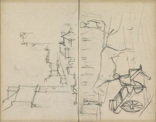 Curator: I find myself captivated by this rather unassuming sketchbook page, a drawing from Breitner, dating back to 1907-1909. It's titled "Gevel en een gezicht op de Prinseneilandsgracht te Amsterdam." Editor: Initially, it feels like catching a fleeting thought – a jumble of lines, an almost ghostly architecture barely tethered to the page. There's a raw honesty about it, a vulnerability, like stumbling upon someone's private musings. Curator: Precisely! Breitner's impressionistic style shines through even in this quick sketch. He wasn’t interested in perfect replication, but in capturing the feeling of a place, a specific atmosphere, the very light bouncing off the canal. Notice the stark contrast of the façade on the left page and what appears to be a piling platform on the right. Editor: It makes me consider the context of the Prinseneiland. This wasn’t a picturesque postcard setting back then; it was a working-class area, full of laborers and industry. Do you think the sketch portrays not just the structure but also an echo of that socio-economic landscape, particularly considering the workers using the piling platform? Curator: I think so. Breitner wasn’t blind to the realities around him. Though part of me wonders if it's less about intentional social commentary, and more about him documenting the sheer dynamism and chaos he found so aesthetically interesting about modern city life. Like a poet drawn to grit as much as beauty, and it might also simply suggest one initial sketch against a subsequent stage, left unfinished. Editor: Fair enough. But consider how even unintentional portrayals still reflect a certain worldview. The composition, with its almost frantic energy, contrasts sharply with the stillness usually associated with canal scenes. It’s refusing that romanticized gaze. Do you see a kind of rebellion? Curator: Perhaps. Although, to me, the very act of sketching like this is a quiet rebellion. A statement that even the mundane, the incomplete, the 'unbeautiful', is worthy of artistic attention. Still, in its unfinished nature, this drawing reflects not only the world outside, but also the one within Breitner's mind as a fleeting memory that perhaps no longer exists. Editor: Exactly. It shows us that even in the quickness of capturing a moment, choices are made, perspectives are offered. It turns the ordinary into an opportunity to examine values. Curator: Well put. Breitner’s fleeting sketches offer a surprisingly profound view, literally and figuratively, through a lens of both time and individual perception. Editor: Absolutely. And maybe that’s the real rebellion – daring to show a working Amsterdam, an unfiltered vision and thereby capturing both labor and progress.