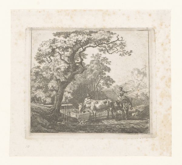 This etching, "Figures at a Farm" by Jan Izaak van Mansvelt, presents a pastoral scene enclosed within a circle, evoking a sense of timelessness. Note the central figure with an outstretched arm. It is a gesture that echoes across art history. Think of classical orators, and even divine figures bestowing blessings. Here, it seems more mundane, a herder perhaps directing or gesturing towards the resting figure. The contrast reveals how grand gestures are distilled into everyday actions. Consider the recurring image of a man resting in art across different epochs, as a symbol of contemplation, leisure, or even melancholy. These archetypes speak to our shared human experiences of seeking respite and meaning. This image, while simple, stirs deep subconscious connections to shared cultural memories. The non-linear, cyclical progression of the symbol of rest, and the herder’s gesture, remind us of the evolving and resurfacing forms and meanings in different contexts.