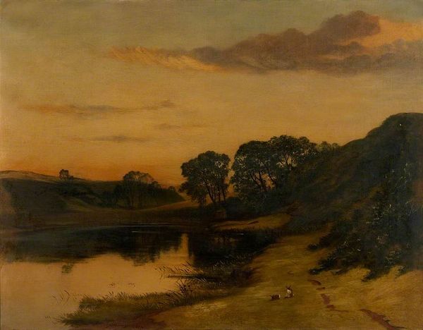 Editor: This is George Harvey's "Dawn on a Scottish Moorland," painted in 1866 with oil paints, probably en plein-air. It has such a solitary feel to it, like a landscape holding its breath. What’s your interpretation of it? Curator: It's fascinating to consider this painting in the context of the 19th-century Scottish Highlands. We often romanticize the landscape, but there’s a powerful historical narrative missing here. Where are the people? What does their absence convey? Editor: Well, you do see some sheep. Maybe that suggests an economy based on wool? Curator: Precisely. Think about the Highland Clearances. Land traditionally held in common was privatized and converted to sheep farming, displacing thousands. Does Harvey’s tranquil dawn actually obscure a more violent story of dispossession? Editor: So, the beauty almost serves to mask a really painful history? Curator: It makes you wonder, doesn’t it? This Romantic style, so celebrated for its depiction of sublime nature, maybe also served a purpose. Could it distract from or even legitimize disruptive socio-political changes? Editor: That's a much darker reading than I initially considered, I guess. Curator: The role of landscape painting evolved substantially across this period, with artists sometimes using landscape to suggest or infer contemporary social realities. Consider what this artistic movement ultimately excluded. It raises essential questions about who benefits from a particular vision of national identity. Editor: This conversation makes me see it, and landscape art in general, with fresh eyes. Thanks! Curator: My pleasure. Looking closely unveils unexpected complexities, I'm happy to discuss further another time.
