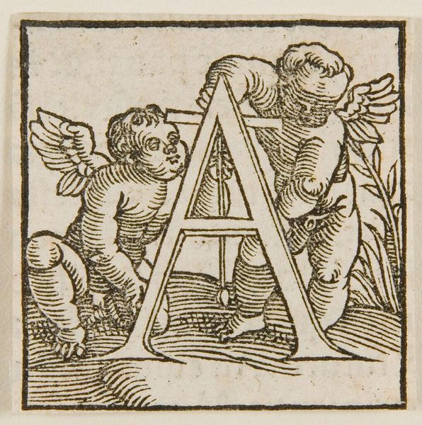 Editor: Here we have an anonymous woodcut print, "Letter Z", from the Harvard Art Museums. It depicts two cherubic figures struggling with the letter itself. What do you see in this piece, beyond the immediately visible? Curator: Consider the cherubs. How does their portrayal, almost toiling with the letter, challenge the traditional, often sanitized, view of childhood innocence? Are they complicit in a system represented by this very letter? Editor: That's a great point. I hadn't considered the work aspect of the cherubs. Curator: And think about how the "Z" itself might stand in for larger systems of power, perhaps even the alphabet as a tool for categorization and control. How does this impact your understanding? Editor: Wow, I never thought of it that way. It gives a whole new layer to something seemingly simple. Thanks! Curator: Absolutely. It's about questioning the accepted narratives.