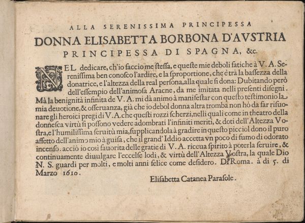 Curator: This is a page from "Teatro delle Nobili et Virtuose Donne…", a 1616 print and drawing now held at the Metropolitan Museum of Art. It's by Isabella Catanea Parasole. My initial impression is how densely packed the text is. What do you make of it? Editor: I notice the prominent dedication at the top. It's addressed "Alla Serenissima Principessa Donna Elisabetta Borbona d'Austria Prencipessa di Spagna, &c." Everything radiates outwards from this tribute to power and lineage. I am sensing respect, reverence. Curator: Absolutely. Parasole dedicates this work to Elisabeth of Bourbon, Queen consort of Spain. Remember that Parasole's "Teatro" offered patterns for lace and embroidery—professions acceptable for noble women. So, by dedicating her work to the Queen, she validates the skills within as part of a cultivated courtly life. Editor: The prominent initial "N" at the start also strikes me. It's ornate, interwoven with foliage or perhaps lace patterns themselves. It almost presents itself as a protective portal for the message that follows, doesn’t it? And reinforces your earlier point. Curator: It does. Look also at the end, where Parasole humbly describes her designs as “rozzi scherzi"—rough sketches—even though they clearly display great skill. This self-deprecating language was commonplace, meant to showcase her humility. Editor: Yet within that humility, she’s cleverly weaving in references to theatre, “theatro della donnesca virtú”, elevating the act of creation itself into a staged performance. Isn’t that a powerful way of embedding those images with cultural currency, beyond just craft patterns? Curator: Indeed. She’s situating her creations within a sophisticated world of artistry and virtue. Also consider the printer's statement at the very bottom: "Si vendono da Maurizio Bona, à piedi di Piazza Navona". It tells us much about the commercialisation of art and its relationship to public spaces at the time. Editor: Piazza Navona, a center of Roman life, transformed into a marketplace for creativity. So, the Teatro connects intimate domestic creativity with an emerging economy of imagery, an art meant for all eyes that speaks to an ideal. Interesting to consider its implications today. Curator: Yes, this single page provides an intimate look into the interconnected worlds of female artistry, patronage, and the burgeoning print culture of the early 17th century. It highlights the important and overlooked contributions women like Parasole made to the era. Editor: It serves as a potent symbol: art carrying the aspirations and achievements of women from the private sphere into broader cultural consciousness.