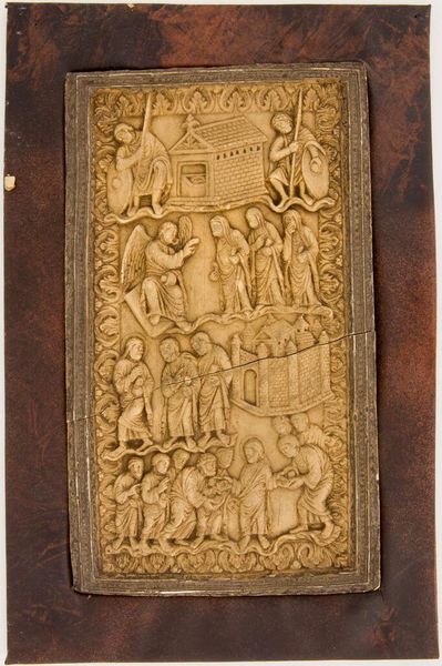 Curator: This small, unidentified artwork at the Harvard Art Museums, “Annunciation and Nativity,” presents a combined scene in carved relief. It's wonderfully compact! Editor: It feels ancient, like a memory half-erased. The figures are worn, softened... they exude a powerful stillness. Curator: The artist, alas unknown, cleverly juxtaposes the Annunciation above with the Nativity below. The composition directs our gaze downward, from divine decree to earthly realization. Editor: Yes, there's a clear structural logic. The pillar visually links the two scenes. A satisfying, almost architectural division of space, though it is a bit crude in places. Curator: I find that crudeness endearing! It suggests an artist less concerned with polished perfection and more focused on conveying profound spiritual events. There's a real emotional directness in it. Editor: Perhaps. Or simply a lack of technical skill. Still, the symmetrical arrangement of the figures creates a sense of balance and harmony. It’s quite pleasing despite the simplicity. Curator: Indeed. It quietly resonates with a narrative that, even in fragmented form, stirs something deep within. Editor: I agree. It’s a piece where the formal structure supports the emotional resonance beautifully, despite—or perhaps because of—its imperfections.