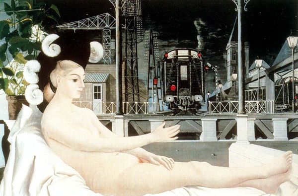 Curator: The trolley in Delvaux's "The Visit to Ephesus" from 1973, rendered meticulously in oil paint, it is tempting to focus solely on the classical allusions in the cityscape backdrop and the female figures, but that is missing the larger socio-historical point. What's your reading? Editor: It does feel very dreamlike and a little unsettling. I see classical architecture, almost like a stage set, and there's a tram! And nude women... it's such a strange mix of historical and... well, industrial elements, and nudes that harken back to classic paintings. Why Ephesus? What am I missing? Curator: Ephesus, a major site for early Christianity. And here the trolley disrupts the timeless quality of the city and its classical themes. The materiality is rich -- how is the paint handled and distributed to reinforce power relations and challenge hierarchies? Editor: So you're saying the choice of a city important for religion, combined with a new-fangled mode of transport, affects the meaning? Like how technological advancements influence culture, and vice versa? Is the way he applies the oil paint supposed to affect the historical power dynamics, or to highlight the artist's involvement in those dynamics? Curator: Precisely. Consider Delvaux's artistic choices. The smooth application of the oil paint emphasizes its illusionistic quality, referencing both academic training and the encroaching modernity of mass-produced imagery that would flood popular consciousness soon after this piece was painted. Does his realism highlight a tension? Editor: I think so, especially how real and 'manufactured' the scene looks all at once. I now notice it emphasizes the unsettling mood of these classic themes meeting modernity in almost mass produced painting processes. Curator: Indeed, so that tram becomes more than a mere vehicle; it's a disruption to these norms of classical painting through Delvaux's process. Editor: Wow, I never would have thought to look at it that way. The trolley seemed just quirky. Curator: It is that! These components open the work up so we consider more. It’s this kind of juxtaposition and production process of the time which ultimately creates this unique modern artwork and lets it defy historical high art hierarchies. Editor: I definitely understand it better. I appreciate that take on this artwork as I couldn't reconcile its individual parts at first.