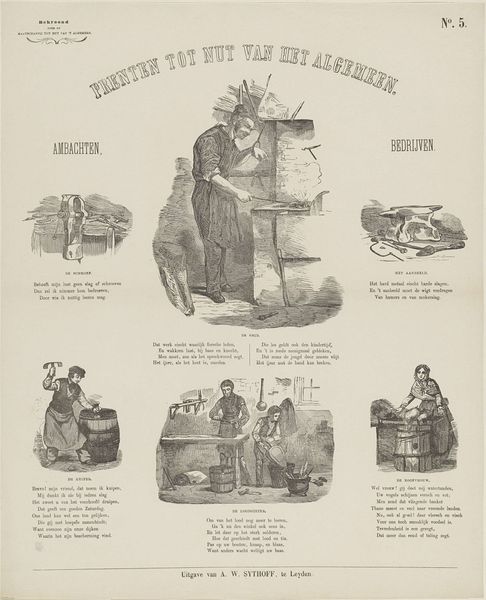 This print, "Ambachten, bedrijven," was made by Albertus Willem Sijthoff. The print, featuring detailed engravings, showcases a range of trades and industries. The images aren't presented as high art, but rather as documentation of work and labor. Note how the materiality of the printmaking process, the lines etched into the metal plate, mirror the work being depicted; each occupation requires precision, skill, and the application of repetitive actions. The scenes of labor within the images highlight the social context of production, showing individuals engaged in various trades. Consider how the print itself is a product of labor, requiring the skilled hands of an engraver and printer. The choice of printmaking as a medium underscores the intention to disseminate knowledge about labor practices to a broader audience. This print invites us to appreciate the artistry found in everyday work, challenging traditional distinctions between fine art and the applied arts.