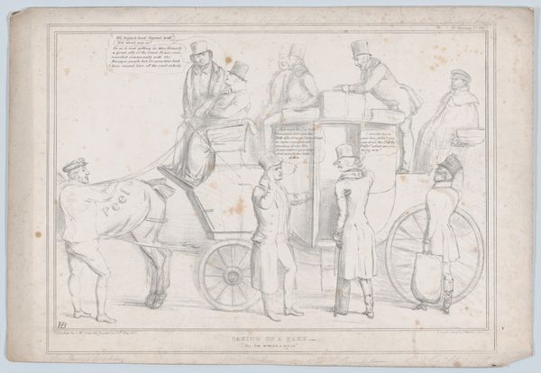 This lithograph was made in England by John Doyle, likely sometime in the 1830s or 40s. It depicts three men riding in a horse-drawn carriage. It’s titled “A New Way to Drive Over an Old Road; How Not, Always, Get Out of Order.” The men in the carriage are Lord John Russell, Henry Inglis, and Lord George Bentinck, all members of parliament. The image uses the visual code of caricature to poke fun at these figures. The metaphor of a carriage being driven in a new way over an old road likely refers to political reforms. Doyle’s work appeared during a time of great social change in England, with the rise of industrialization and the expansion of the British Empire. Political cartoons like this one offer insight into British social life during this transformative period. To understand more, historians consult parliamentary records and newspapers to understand the political context. We can then see how Doyle’s work contributed to public discourse and shaped popular opinion.