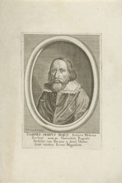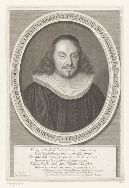 This is Johann Alexander Böner's "Portret van Hartmann Mogen", a detailed engraving of a clergyman of modest dimensions, housed here at the Rijksmuseum. The visual experience is dominated by the oval frame, densely inscribed and containing the figure of Mogen, who is centrally placed and gazing directly at us. The portrait balances light and shadow, with the subject emerging from a darker background, drawing our attention to his face and the book he holds. Böner's lines are precise, creating texture and depth, particularly in the rendering of the ruff and the subtle gradations of light on Mogen's face. Böner employs the structural device of the frame to contain and define his subject, but also to integrate text as part of the visual composition. The inscription, acting as a border, elevates the portrait beyond a simple likeness, layering it with symbolic meaning and historical context. It challenges the purely representational and invites a semiotic reading where words and image combine to construct meaning. Here, form functions as a carrier of content, engaging us in a dialogue about representation, identity, and the power of visual language to both reveal and conceal.