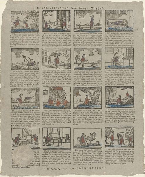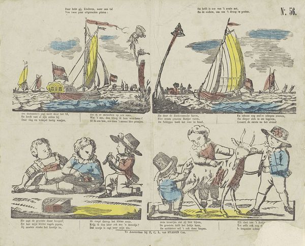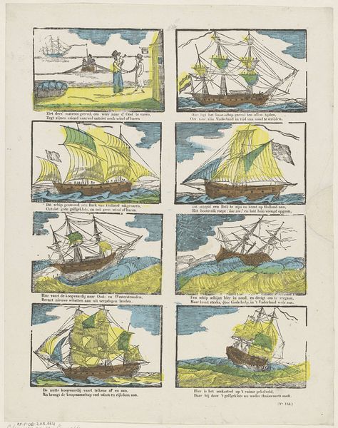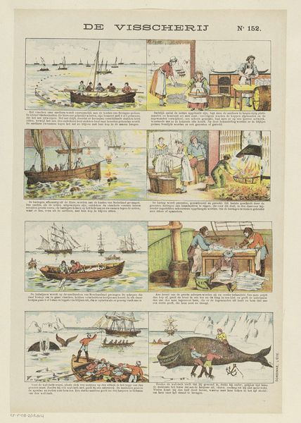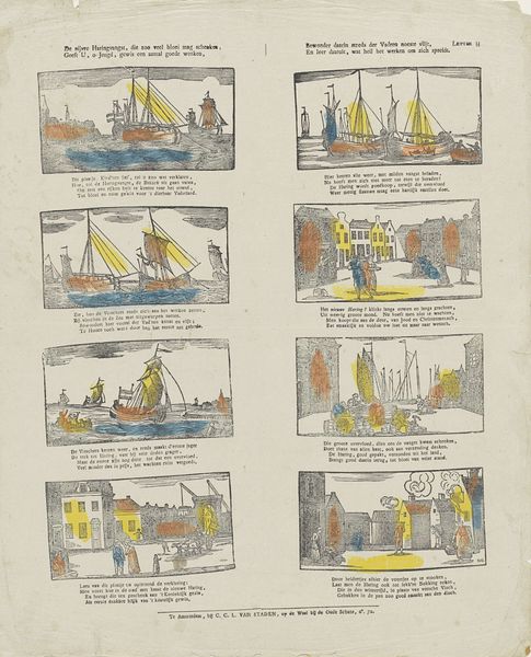 This print by M. Hemeleers-van Houter, made without a specified date, presents scenes of herring fishing. The composition is structured as a grid, dividing the narrative into discrete, sequential panels. The colors are applied flatly, with bold outlines defining shapes that have an almost diagrammatic quality. The arrangement of panels invites a semiotic reading, where each scene acts as a signifier within the larger narrative of labor and industry. Note how the artist juxtaposes images of maritime activity with those of urban life. This contrast suggests an interplay between the natural and the built environments, reflecting broader 19th-century debates about industrialization and its impact on society. The schematic rendering of figures and objects flattens the space, emphasizing a focus on collective action rather than individual experience. This formal choice is not merely aesthetic; it serves to underscore the communal nature of work and the values associated with productivity and progress. These prints offer not just a visual experience but also a cultural text, inviting ongoing interpretation.