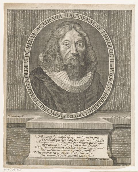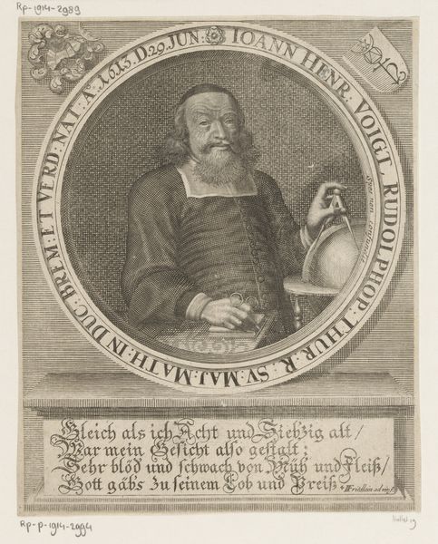 Curator: Here we have "Portret van Aegidius Wild," dating roughly from 1673 to 1721. It's a print, specifically an engraving, on metal. Quite detailed, wouldn't you say? Editor: Absolutely. Immediately, the dense lettering encircling the figure creates a strong visual frame and adds to the overall somber, almost severe mood. You can almost feel the weight of history pressing down. Curator: That inscription is important. It denotes Wild's status and accomplishments – his titles, positions, age. Notice how the engraver uses line weight to emphasize certain words, drawing attention to his virtues. The lettering becomes another layer of iconographic detail alongside Wild's somber robes. Editor: While the Baroque period embraced ornamentation, the lines here, however fine, feel restrained, almost economical. Perhaps speaks to the pragmatism embedded within the context of production and also religious discipline that might be associated with the figure of Wild, as well. Curator: Precisely. The book he holds symbolizes his knowledge and authority, also subtly indicating divine knowledge of faith and virtue. His gaze, directed straight at us, is meant to convey piety and seriousness, the emblems of a respected minister. Editor: And the craft involved, look at the detail of this rendering. How metal as a reproductive technology allowed dissemination to communities beyond, which is quite interesting when considering what exactly these engravings circulated to achieve during their time and in their immediate geography. Curator: An engraving is never just an engraving, isn’t it? It carries the weight of social standing, aspirations, and memory of a specific community. Editor: It does. Looking closely has made me see it a bit differently - perhaps it captures the spirit of its time with both its materiality and how these very lines made it. Curator: Indeed, a confluence of image, status, craft and the man himself!