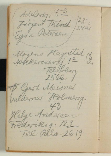 Editor: This is "Adresser," created between 1937 and 1938 by Niels Larsen Stevns. It's a drawing in ink and pencil on paper. It appears to be a page from a notebook or address book, with handwriting in the upper right quadrant. It's simple, almost mundane. How should we interpret a work like this? Curator: Think of this work, not as simply a list, but as a fragmented narrative reflecting the artist's lived experience. Stevns created this work in a tumultuous historical period; pre-war Europe was wrestling with questions of nationalism, identity, and power. The presence of addresses is poignant; who are these people, and how are they connected? Editor: That makes sense. So, you're saying that even something seemingly ordinary can be read as a social or political document of its time? Curator: Precisely. Consider also that address books were highly personal items, mapping one's social networks, particularly for those navigating unstable geopolitical terrain. Who did this artist maintain contact with? How might we uncover why this specific page was preserved as art? Also, do you notice that in the text one can see written "Pale 700gX?" Editor: Yes, it almost appears that the drawing has a practical usage and is part of a longer address list. What kind of implications does it bring knowing this about the artist? Curator: I suggest that Stevns may be making notes within an economic, political, and artistic nexus that demands from us as interpreters to recognize his broader commentary on belonging, exile, and survival in a society constantly reshaping itself. This reading connects the work to themes of human experience within specific historical and social contexts. Editor: It's amazing how seeing the context transforms what I initially thought was just a page from a notebook into something far more complex and relevant. Thanks! Curator: Indeed! Now, how does understanding this context shape your perspective on the work’s aesthetic and conceptual value?