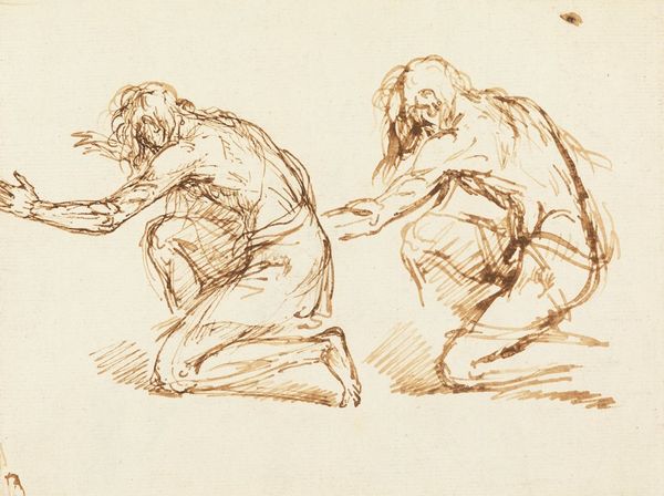Editor: Here we have "Two Studies of a Man Working on His Knees," a pencil drawing by Guillaume Anne van der Brugghen, created sometime between 1821 and 1891. It feels very intimate, like a glimpse into the artist's personal sketchbook. What strikes you when you look at this work? Curator: Ah, yes, intimate is precisely the word. It's as if we've stumbled upon Van der Brugghen in a quiet moment of observation. You know, I find myself wondering what task has consumed this figure so completely. What's so captivating down there on the ground? Or could it be the artist is less interested in showing a worker, than trying to understand human movement and pose? Editor: That's interesting, I hadn't considered that. It did seem unfinished, maybe it was just an exercise? Curator: Precisely! The sketch-like quality gives it such immediacy. Notice the quick, confident strokes; you can almost feel the artist's hand moving across the page. And the shadow play…it's quite masterful, no? Consider, though, if he’d tried to perfect this image, wouldn't some of that fresh appeal be lost? Editor: I think so! The rough lines are more interesting than hyper-realism would be. It's almost like witnessing the birth of an idea. I’m wondering if he then used the study to create something else. Curator: Perhaps, or perhaps the beauty lies in the attempt itself. I love seeing such candid pieces that were not made to be sold but to improve his vision, you know? A lot of charm lives in pieces like these. It's easy to lose sight of that in grander, more finished works. Editor: It's definitely given me a new appreciation for the artistic process, and to celebrate sketches. Curator: Indeed, art isn’t always about the final flourish. It’s equally about the tentative first steps, the quiet explorations in a sketchbook, the artist’s intimate dance with their subject.