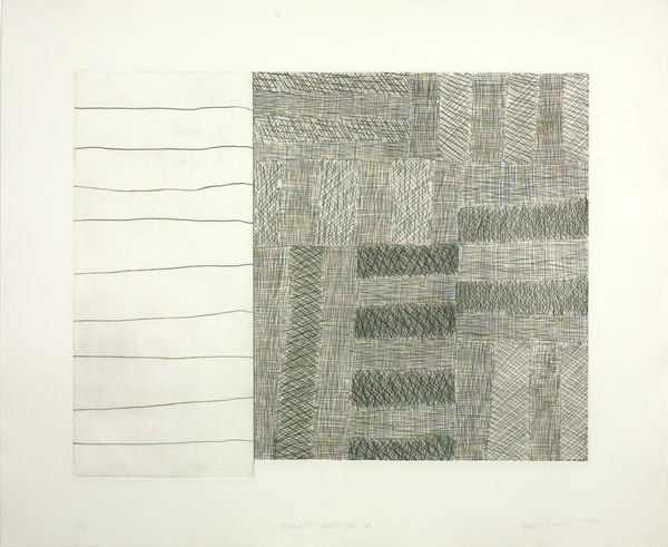 Curator: This is "Trellis," a piece by William Gear. Editor: Immediately I'm struck by the sense of constraint, but with a glimmer of something golden breaking through. Curator: Gear, born in 1915, engaged with abstraction after the war, finding a visual language that reflected the shifting cultural landscape. He explored the grid throughout his career. Editor: Absolutely, and you see the grid here representing systems, the way society can confine, but the unexpected hues suggest hope. Is it about resisting those structures? Curator: It could be. His work often played with geometric forms, perhaps echoing the rebuilding of urban spaces at the time and the role of the individual within those spaces. Editor: It’s a powerful statement on the post-war world, a reflection of resilience and the persistent search for freedom within constraints. Curator: Yes, I agree. It's interesting to see how those social anxieties played out across his broader body of work. Editor: For me, thinking about this piece through the lens of social control helps me see the gold as a promise of change, a reminder of our agency.