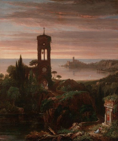 Editor: This is "Monk Meditating near a Ruin by Moonlight" by Frederik Marinus Kruseman, painted in 1862 using oil paint. It's quite atmospheric. The ruined structure and the figure of the monk create such a somber mood, and the composition emphasizes a sense of solitude. What strikes you most about the artwork? Curator: The distribution of light and shadow is, I believe, the most compelling element. Observe how the artist manipulates chiaroscuro, creating dramatic contrast between the illuminated moon and the darkness engulfing the ruin. It emphasizes the textures and decaying materiality of the architecture. Consider, too, the dynamic relationship between the verticality of the ruin and the horizontality of the landscape, isn’t it unsettling? Editor: It is. So, the formal elements are more crucial to understanding it than, say, its historical context? Curator: Undoubtedly. Though knowledge of Romanticism enriches one's understanding, the intrinsic qualities of the painting are where the essence lies. Note the use of a muted, almost monochromatic, palette and how it conveys a sense of decay and transience. What emotional effect does the painting have on the viewer, based purely on its visual form? Editor: It definitely amplifies that sense of melancholic reflection. It's interesting how the limited color palette and strong contrasts work together to create that mood. I’ll have to look closer at light and composition. Curator: Indeed. Considering solely the visual construction offers a different vantage point, which brings us closer to the artist's intention, perhaps, through its materiality and construction.