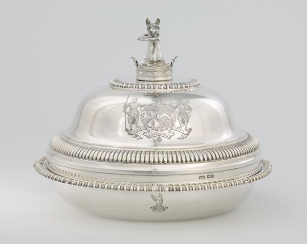 Editor: Here we have the Oval dish cover, crafted in 1819 by Jean-Baptiste-Claude Odiot, using silver and gold. Its lustrous finish and symmetrical ornamentation exude elegance. What stories do you think this piece whispers from its gilded surface? Curator: Oh, doesn't it just gleam with an aura of decadent dinners long past? It’s Odiot at his Neoclassical best. See how he's tamed the silver, molded it into this disciplined form, a monument to luxury, almost. The acanthus leaves whisper Roman grandeur, don’t they? I can almost hear the clinking of champagne glasses and polite, hushed gossip! What catches your eye most? Editor: Definitely the precision of the engraving—those floral motifs seem so delicate, almost impossibly so on metal. Were such covers purely decorative, or did they serve a more practical purpose? Curator: Both, my dear! Utilitarianism cloaked in breathtaking beauty. Silver retains heat beautifully, so yes, it kept your pheasant warm, darling. But imagine the statement it made—the sheer artistry displayed before your guests. It's not just food; it's theater! Though, frankly, I'm more fascinated by what it conceals… the potential within, if you will. What visions bloom when you imagine the contents? Editor: It conjures up visions of lavish banquets! Thinking about what’s underneath as an artistic device—a blank slate prompting the viewers imagination, that makes this even more interesting. Thanks! Curator: Precisely! That shimmer… it holds untold possibilities. A delicious mystery served with impeccable style. Don't you agree? It makes you rethink ‘dinnerware,’ doesn't it?