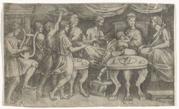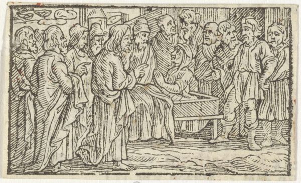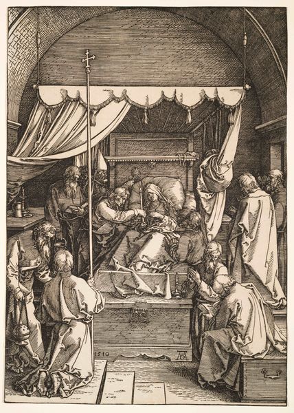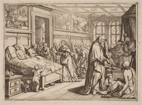 Editor: We're looking at "Rich Man on His Deathbed" by Georg Pencz, created between 1542 and 1543. It's an engraving, giving it such a detailed and linear quality. The scene is quite dramatic and staged. What can you tell me about its broader historical meaning? Curator: This print throws into sharp relief the anxieties of wealth and mortality in the Northern Renaissance. The rich man's demise is depicted not as a private affair, but a public spectacle. We see the performance of grief, the conspicuous display of wealth unable to buy health, and even, in the background, a whole community seemingly dependent on this man. Editor: A public spectacle, that’s interesting. I hadn't considered the community element in the background. Curator: Think about the function of imagery at this time. This print, while depicting a specific genre scene, would have circulated widely, acting almost as a moral lesson. What statement is being made by prominently showing us the man’s wealth—the finery, the concerned entourage? It subtly questions the social order. The question here is not simply, "What is death?" but also, "What is the responsible use of wealth?" Editor: So, it's more than just a depiction of death; it's a commentary on wealth and social responsibility? Curator: Exactly. Consider the intended audience. Was it for the wealthy elite themselves, perhaps a memento mori? Or was it aimed at a broader populace, instilling ideas about the pitfalls of excessive materialism? Pencz gives us a potent image that allows people to see an almost theatrical warning, offering potentially differing takeaways depending on social positioning and personal morals. Editor: That completely shifts my understanding of it. It's not just a historical snapshot; it's a politically charged piece. Thanks! Curator: And considering its reproducibility as a print, it could really impact a greater audience at a very significant moment in history.