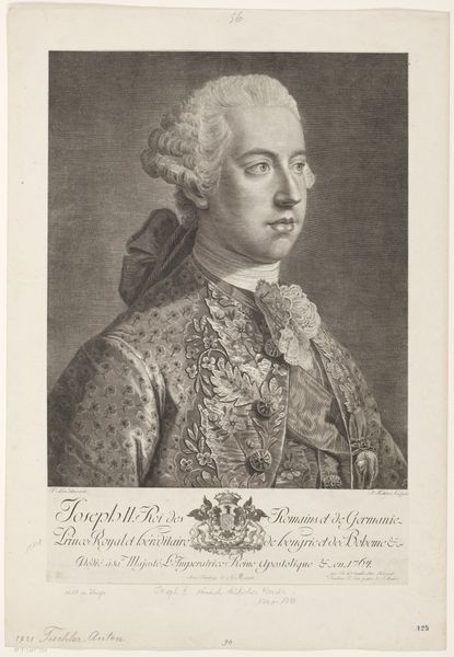 Editor: This is a really fascinating engraving. "Portret van Henri Léonard Jean Baptiste Bertin," made sometime between 1769 and 1790 by René Gaillard. It gives off such a formal and imposing vibe, doesn't it? All those intricate details…it's hard to believe it was all done by hand. What strikes you when you look at it? Curator: You know, I feel this image whispering stories from a very different world. I sense power, of course – the subject, Bertin, practically radiates authority with that elaborate suit and the sword hinting at…well, let's just say enforcing order. But there's a softness, too. I get the feeling that, deep down, he's contemplating something beyond state affairs, beyond that elaborate wig! Do you see it, too? It's there in the subtle way he holds the paper…almost nervously. Editor: Now that you mention it, I do see the hint of nervousness. And it does make me wonder, what secrets that piece of paper holds... Was he well-liked? What did he do to rise so high? Curator: Those are great questions. We know that, as a Minister and Secretary of State, Bertin navigated some tumultuous political waters in pre-revolutionary France. Perhaps that little paper held decisions of incredible consequence. The engraving, in itself, is a carefully crafted statement – a way to project power, but art always leaves space for interpretation, wouldn't you agree? It's those glimpses of humanity that resonate across centuries. Editor: Definitely. I came in thinking just, “Wow, fancy guy.” But seeing it as a captured moment of a person facing a complicated world makes it so much more interesting. Curator: Exactly! And it reminds me that behind every historical figure and formal portrait there are humans, with stories we can only imagine. That's the magic, isn't it?