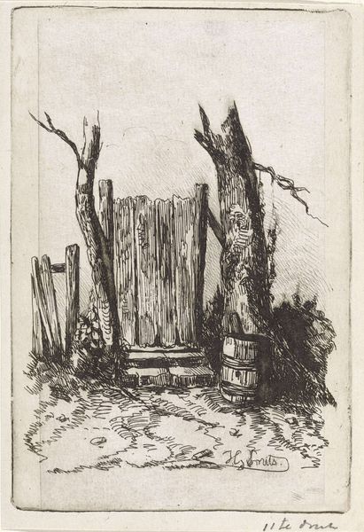 Curator: It strikes me as a rather stark image, almost unsettling, despite its humble subject. Editor: Indeed. What we're looking at is "Vedby kors" from 1843, a woodcut by H.C. Henneberg. It resides here at the SMK, the Statens Museum for Kunst. It appears to be a simple rural scene. Curator: The cross definitely dominates the foreground, doesn't it? And it isn’t necessarily presented as something comforting. Instead, it feels abandoned, a bit dilapidated perhaps, left behind. It stirs feelings related to the uncanny. It sits just so, amongst this dilapidated fence and wild field with looming hills in the background. Editor: The choice of realism is fascinating here, as it strips away any romantic idealization that might typically be associated with religious symbols or the rural landscape. It mirrors socio-political movements within religious thinking in the 19th century. We are confronted with the actual, lived experience of faith. Curator: I wonder what the cross itself signified at the time. A boundary marker, a symbol of faith rooted in the land? Editor: The use of a common wooden cross rather than an ornate one reinforces this sense of groundedness, an authenticity. And consider how a humble material like a woodcut print further emphasizes the accessibility, the almost democratic nature, of this visual language. Curator: You know, seeing it in that light gives it a deeper resonance. The cross, weathered and leaning, can be interpreted as the faith of the common person, enduring despite hardship, subtly defiant, even in its imperfect presentation. Editor: Exactly. Its message is more radical than a surface viewing reveals. By refusing idealized imagery, Henneberg makes space for a more potent kind of connection between the individual and the spiritual world, through an awareness of nature. Thank you for walking us through the uncanny yet socially grounded experience of faith that this work may trigger in audiences. Curator: Thank you for the sociopolitical and institutional history which opens it all up for a renewed experience.