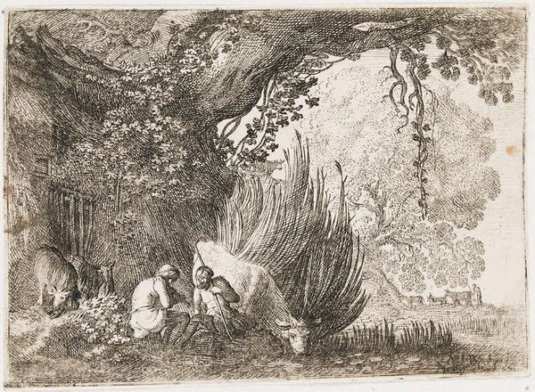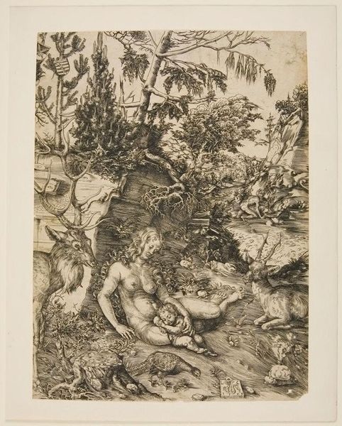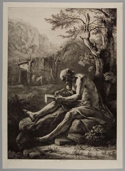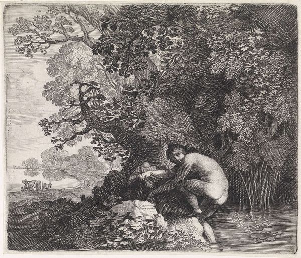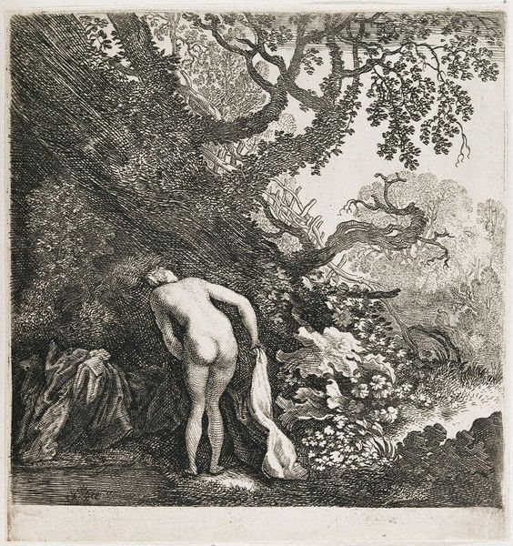 Curator: This etching is titled "Bather Stepping from a Forest Pool" by Moyses van Uyttenbroeck. Editor: It evokes a rather melancholic mood, doesn't it? The stark monochrome palette and dense foliage contribute to a sense of secluded contemplation. Curator: The landscape is certainly prominent, almost overshadowing the bather. One wonders if this reflects anxieties around changing attitudes to nature during the early modern period. Editor: Perhaps, but look at the woman's posture. It's a masterclass in contrapposto, drawing our eye towards the soft curvature of her body against the angular lines of the trees. I see a careful balance between the figure and the ground. Curator: I grant you that the technical skill is undeniable, but I can’t help but wonder, who was this bather meant to represent? What role did idealized nude forms play in creating and reinforcing notions of femininity? Editor: Regardless of intent, the interplay between the organic forms and the human figure creates a palpable tension. It’s a striking example of Uyttenbroeck’s ability to weave visual narratives using light and shadow. Curator: Indeed, it leaves us with much to consider about the artist's world and our own. Editor: Precisely. It is a work that yields new insights with each viewing.