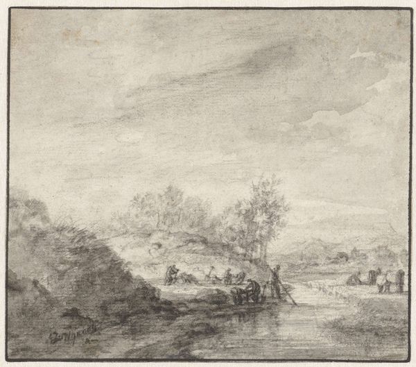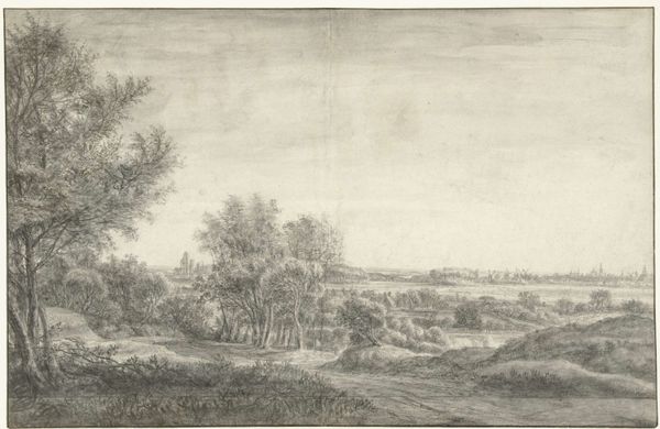 Anthonie Waterloo rendered this landscape with a river in the foreground using pen and brown ink, and grey wash. The washes are applied with real skill, giving depth and form to the copse of trees and the distant buildings. Look closely, and you can see how Waterloo built up the tonality in layers. It’s a technique related to watercolor painting, though here, the shades of grey give the scene a more austere feel. Waterloo was a prolific maker of these landscape drawings, selling them to collectors. As such, the drawing represents a fascinating intersection of art and commerce. The artist’s hand captures the scene, but also serves the demands of the market. This wasn’t a portrait of a specific place, but rather, an idealized version of nature, made efficiently, and made to sell. Considering the materials, the making, and the context allows us to better understand the cultural significance of this seemingly simple landscape.