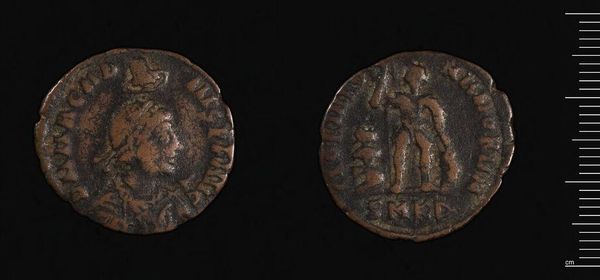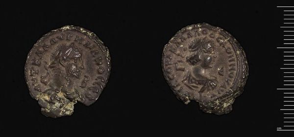 Editor: This is the Tetradrachm of Azes II, a Scythian coin at the Harvard Art Museums. Given its age and purpose, it’s surprisingly detailed. What stands out to you? Curator: The coin's visual elements speak volumes. Observe the deliberate composition: a mounted ruler on one face, a standing figure on the other. Consider the line work, the arrangement of text around the figures. How do these elements contribute to the overall impact? Editor: It's interesting how the wear and tear almost adds to its texture. Is there a significance to the symbols used? Curator: Precisely. The symbols invite us to decode their meaning. Think about the possible connections and structural relationships among these motifs. How might they reflect the power or ideology of Azes II? Editor: I hadn't considered the interplay of the figures and symbols that way. Curator: Through careful study of the coin's forms and their arrangement, we begin to unlock its intended effect.