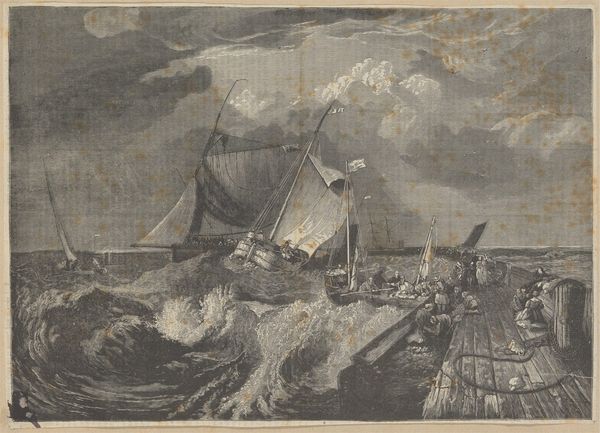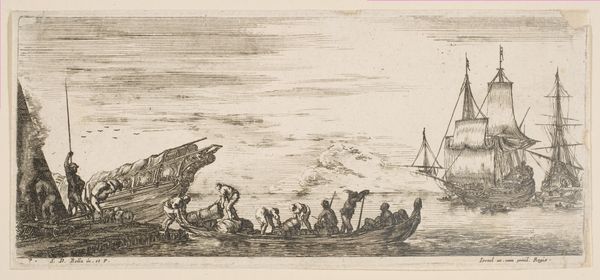 Editor: Here we have Willem Basse's etching from 1634, "Caesar Crossing Stormy Seas". The choppy lines create a dramatic feel – what do you make of the stark contrast and the story being told? Curator: It is an interesting display of printmaking technology in the 17th century. Notice how the line work doesn't just depict the scene, but is inherently *part* of its production. Consider the labour: the craftsman carefully etching each line, mirroring but never quite equaling mass reproduction of imagery and power, how is the role of the engraver, or printer presented in Dutch society? Editor: So, it’s not just about illustrating Caesar, but also about highlighting the engraver's role and technique? Curator: Precisely! Think of it as materializing a narrative. The paper itself, the ink, the press... they all play an active part in translating history. Who owned this print, and how was its message shaped by their consumption of it? Was it aimed to serve the purpose to teach or decorate a space. And the artist themselves, how did the political context contribute to art production, how has their contribution shaped historical knowledge? Editor: It almost elevates the craft, beyond just a means to an end. Curator: Indeed. The materials and method become integral to interpreting the image itself and the surrounding socio-economics of print consumption in that era. Editor: This gives me so much to think about – seeing the process as meaning, and the relationship with society. Curator: Exactly, by recognizing the material circumstances, we uncover so much more about its role in shaping history.
