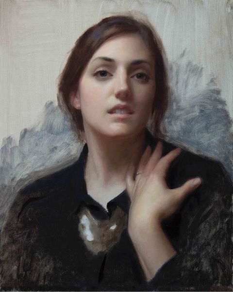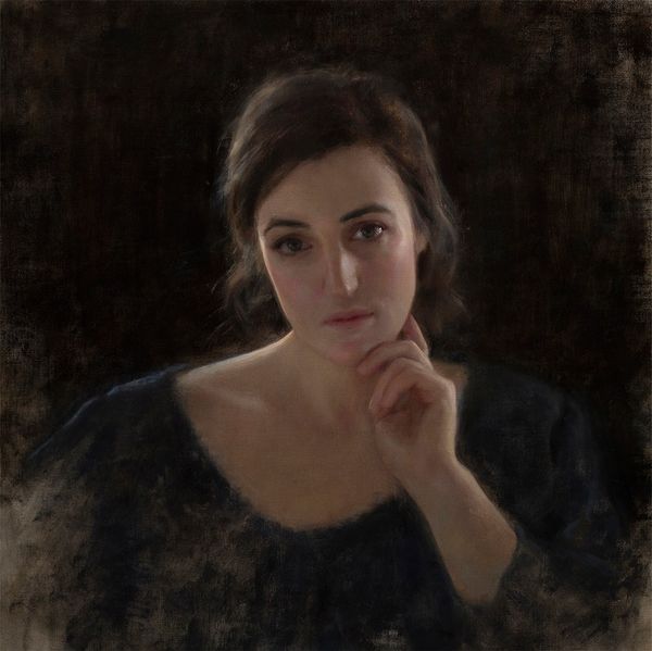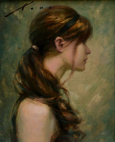 Editor: This oil painting is titled "Crimson" by Adrian Gottlieb. Its dating is not provided. I’m struck by how peaceful the subject looks; the downward gaze and the rich, deep color scheme create a sense of inward reflection. What stands out to you? Curator: What strikes me is the romanticized realism, which, within the art world, operates as both a technique and a statement. Here's a portrait that echoes the Pre-Raphaelites' hyperreal detail, yet subtly sidesteps the overtly allegorical narratives they favored. Consider how contemporary this makes the piece feel, almost like a pushback against the dominance of abstract and conceptual art that historically overshadow figurative work. Editor: That’s interesting! I hadn’t considered the possible socio-political implications of realism itself as a choice. Do you see any further dialogue with art history, in terms of subjecthood or medium? Curator: Absolutely. The choice of oil paint harkens back to a tradition of portraiture often associated with power and status, yet the intimacy and stillness invite a very different kind of interaction. It challenges traditional art institutions who are accustomed to controlling meaning through context and placement, pushing the public to consider what it means to "own" someone’s image. Do you find the title evocative? Editor: I think the title “Crimson” gives a clue, maybe focusing our attention on her vivid red hair and implying it's central to her identity? And from what you say, her simply choosing to present herself in paint as she sees herself is what truly matters. Curator: Exactly. Understanding this dialogue—between artistic tradition, public expectation, and the artist’s intention—offers us a richer experience. Thanks for exploring this painting with me! Editor: Thank you! I'll certainly look at art differently now.