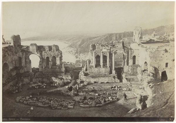 Editor: This striking photograph by Francis Frith captures the Propyloea in Athens. I'm immediately drawn to the textural contrast between the smooth columns and the chaotic rubble at their base. What visual elements stand out to you? Curator: The composition is undeniably powerful. Note how Frith employs a rectilinear structure through the columns and lintels. It produces a grid, which is then disrupted by the foreground. This juxtaposition creates a visual tension, doesn't it? Editor: It does! It feels like a structured ideal collapsing into ruin. Curator: Precisely. The photographer's tonal range is also important. Light and shadow dance across the stone, creating a semiotic relationship between presence and absence. Is it effective, in your opinion? Editor: Definitely. Seeing the play of light emphasizes the damage, but also a sense of enduring strength. Thank you, that’s a great perspective. Curator: My pleasure. It's been a valuable exploration for me as well.