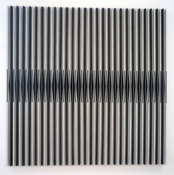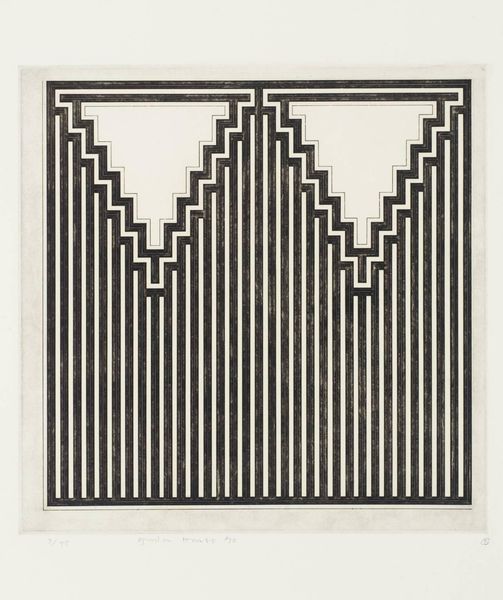 Tess Jaray made this geometric print, Vault, probably using screen printing or a similar technique that allows for such clean, sharp lines. It is all about the relationships between the black lines and white space, a real back and forth, like a visual call and response. Look closely at how the lines converge and diverge. See how they build a kind of architectural form, a pyramid maybe, but also a kind of optical illusion that makes the surface feel like it is both rising and receding at the same time. There's a kind of cool, detached quality, but also a really strong sense of order and rhythm. It reminds me a little of Bridget Riley's Op Art, but with something more structural. Both artists are interested in how our eyes and minds perceive space and form, and how simple elements can create really complex effects. Like a good conversation, the beauty of this piece lies in the push and pull.