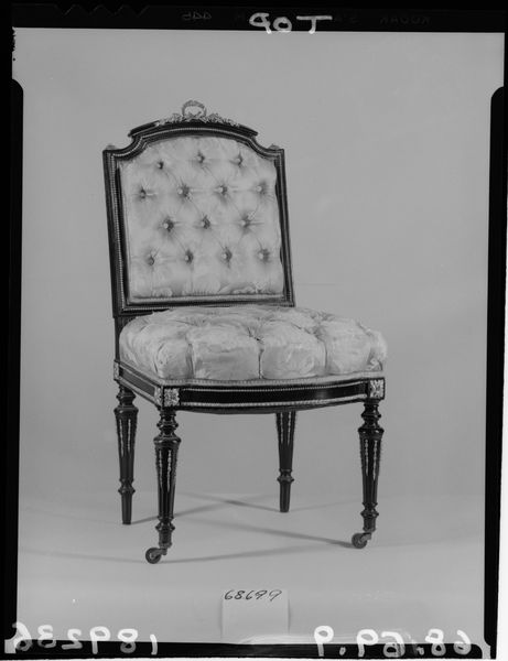 This side chair, made by Léon Marcotte, presents a compelling study in contrasts. The dark, almost severe, lines of the wooden frame are softened by the plush, buttoned upholstery of the seat and back, creating a visual dialogue between rigidity and comfort. The chair's structure is defined by its verticality, yet this is tempered by the subtle curves of the legs and the ornate cresting at the top. This interplay of straight and curved lines introduces a sense of dynamic tension. The glossy surface of the wood contrasts with the matte texture of the fabric, enhancing the tactile richness of the object. Here, Marcotte seems to be exploring the semiotics of furniture design. The chair is not merely a functional object but a signifier of status and taste. The lavish ornamentation and refined materials speak to the cultural codes of luxury and exclusivity that were prevalent during this period. The chair challenges fixed notions of simplicity and functionality, inviting us to reconsider the social and aesthetic values embedded in decorative arts.