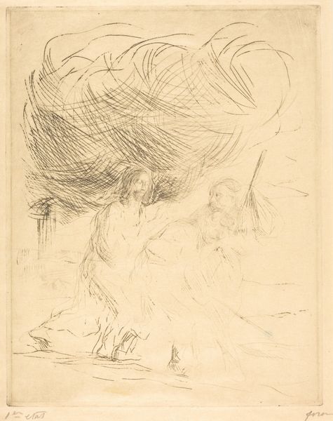 Editor: This is "Ruiter met hond," or "Horseman with Dog," by Anthonie van den Bos, created sometime between 1778 and 1838. It's an etching, pencil and ink drawing at the Rijksmuseum. The sepia tones give it such a classic feel. What do you see in this piece? Curator: What I see first is movement, right? Even in the stillness of the image, there's a powerful suggestion of a horse and rider caught mid-gallop. I'm reminded of the Baroque period's fascination with capturing dynamic energy, even if this piece leans into a somewhat later period. Look how Van den Bos uses delicate lines to create a sense of depth and how the rider seems to command not only his steed but the entire scene. It almost feels like a fleeting vision, doesn't it? Editor: It does. It feels a bit dreamlike actually, because some sections have bolder linework and other parts are faint. It makes the subject look further away than it might actually be. Curator: Precisely! And what about the relationship between the rider and the dog? I find myself wondering if the dog is leading them onward or simply trying to keep up. Are they off to war? Is it just a hunt? And how does that tension, between leading or following, echo through other relationships? A fun thought experiment, isn’t it? Editor: That’s an interesting point; I hadn’t considered the ambiguity of their roles. I initially focused on the skill required to capture a horse's movement so well! Curator: And capturing movement it is; an achievement! A sketch gives just a hint of the whole story and relies on your, our, imagination to flesh it out. Editor: Well, I will definitely remember to look for narratives hidden in plain sight from now on. It is cool how a simple line drawing can provoke deeper thought! Curator: Absolutely. Art isn't always about grand statements. Sometimes, it's in the quiet moments like these where you'll find yourself asking the most profound questions.