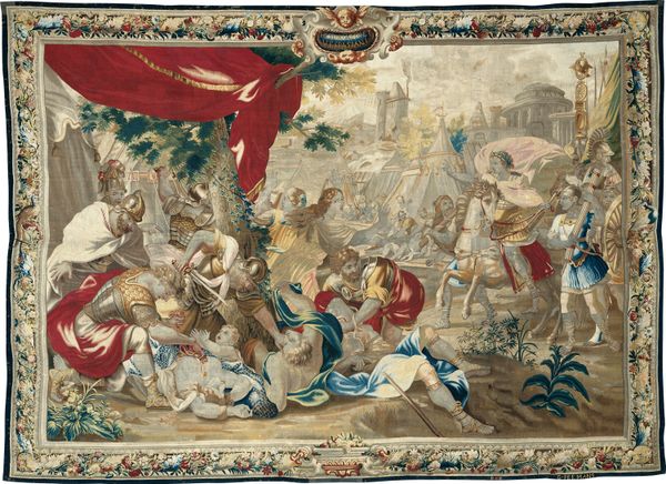 Woven by Karel van Mander the Younger around the start of the 17th century, this tapestry captures Alexander the Great leading his troops across the Granicus River. Observe how Alexander, positioned prominently, raises his arm, a gesture of command. It echoes the classical world and recalls images of emperors and gods. Think of Augustus of Prima Porta, for example. This act of raising one's arm in triumph, in charge, is a symbol of power found throughout art history. Its potency stems from its ability to evoke subconscious associations with leadership and authority. Interestingly, the image of the triumphant leader raising his arm has morphed over time, appearing in religious contexts, such as Christ, or in political propaganda to inspire and mobilize populations. It taps into our collective memory, eliciting an emotional response tied to our understanding of power dynamics. The tapestry's composition, dense with figures, emphasizes the chaos and valor of battle. Ultimately, the enduring image of Alexander transcends temporal bounds. It resurfaces, evolves, and takes on new meanings, demonstrating the cyclical progression of symbols across generations.