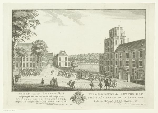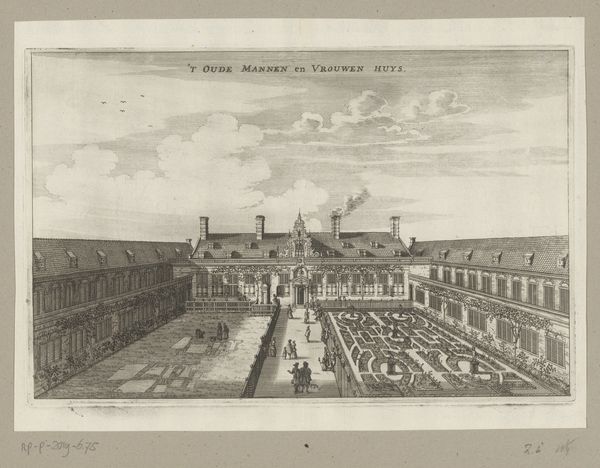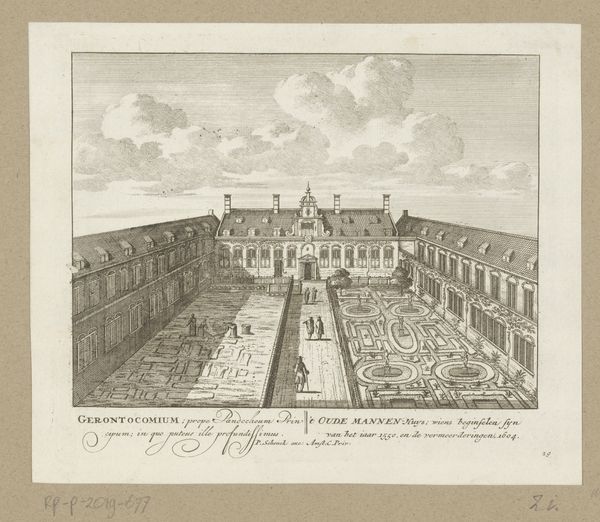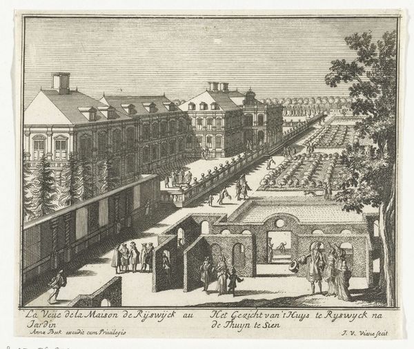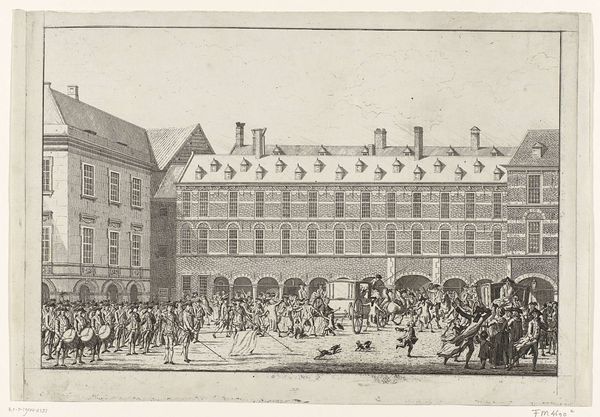 Pieter Schenk created this print of the courtyard of the Hof te Dieren. While the exact date isn't known, we know it was made sometime between 1660 and 1711. This image provides a window into the opulence and order of the Dutch elite during the late 17th and early 18th centuries. The architecture emphasizes symmetry and control, mirroring the social structures of the time, in which class distinctions were visibly expressed through dress, leisure, and even the ownership of dogs, as depicted here. It’s easy to imagine the conversations that might have occurred in this courtyard. We can speculate about the social hierarchies in play. Who had access to this space, and who was excluded? The image raises questions about power, privilege, and the visual markers of status in Dutch society. It captures a moment in time, but also invites us to consider the broader context of the Dutch Golden Age and its legacy.