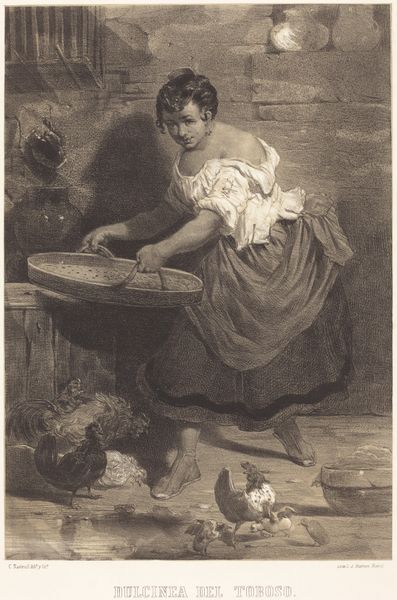 Curator: So, here we have Otto Scholderer's "Greengrocer," drawn in pencil in 1889. What jumps out at you? It feels like looking into someone's memory, doesn't it? Editor: It does have a soft, hazy quality! The composition, with the young woman and the bounty of produce, gives it a feeling of…quiet industry. How do you interpret her gaze, looking off into the distance like that? Curator: Ah, that's where the magic lies! Is she thinking of home? Or perhaps dreaming of her future? Scholderer captures that feeling of being suspended, like a moment caught between dreams. Do you see the slight tension in her brow? It's like she's on the verge of understanding something important about herself. Editor: Yes, there's definitely a melancholic feel. Do you think the medium, the pencil drawing, adds to that? It's not as bold as, say, an oil painting. Curator: Absolutely! The softness of the pencil allows for a subtlety, a gentleness, that mirrors the woman's quiet contemplation. The shading almost whispers, doesn't it? But it also makes you consider the fleeting nature of youth and beauty, like a perfect peach that will eventually bruise. Do you get that feeling? Editor: I do, actually. The rough strokes definitely play to those themes! So, it's not just a portrait; it's a snapshot of a fleeting moment and deeper emotions. Curator: Exactly! And that’s the beautiful thing about art, isn’t it? It holds a mirror up to ourselves, inviting us to reflect on what it means to be human. It whispers to us... doesn't it? Editor: Absolutely, it is! This artwork is a compelling story that opens new questions in unexpected ways. Thank you so much for that perspective.