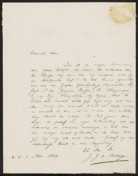 Editor: We’re looking at “Brief aan anoniem,” or “Letter to Anonymous,” possibly from 1859, by Frits van Gendt. It’s a handwritten letter, a drawing in pen and ink. I’m struck by the care put into the lettering, it feels very personal. What draws your attention in this work? Curator: For me, the material conditions of this letter are fascinating. Think about the paper itself—its source, the labor involved in its creation. Then consider the ink, how it was manufactured and distributed. And of course, the pen. This isn't just a message; it’s the product of a specific network of industrial and artisanal practices. It’s interesting to consider what this anonymous message may be and why hand-written production techniques were implemented. Editor: So you see it less as a personal message and more as an object produced by a larger system? Curator: Precisely. The “personal” is always mediated by the material. How did Van Gendt learn his penmanship? Who produced the nib that shaped those letters? These details place the artwork into broader economies of skill and industry, questioning our notion of singular artistic creation. Does that shift your perspective at all? Editor: It does. I was so focused on the expression in the handwriting that I didn't consider the processes behind the materials themselves. Curator: And by recognizing these material processes, we begin to unpack the social context surrounding its making: access to resources, literacy, communication, it’s a whole historical network embedded in this single page. Editor: I’ll definitely look at materials differently from now on, seeing them as part of a larger, interconnected system that influenced the art. Curator: Exactly, the "Letter to Anonymous," while possibly a secret, becomes something more than a sentiment. It becomes evidence of an entanglement between art, labour and industry.