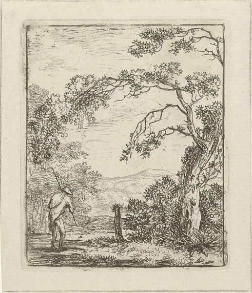 Johanna de Bruyn created this landscape with rider in 1777 through etching, a printmaking technique that democratized image production. De Bruyn would have covered a metal plate with a waxy, acid-resistant ground, then scratched her design into the surface, exposing the metal. Immersing the plate in acid would bite away at these lines, creating grooves. Ink was then applied and the surface wiped clean, leaving ink only in the etched lines. Finally, the plate would be pressed onto paper, transferring the image. The fine, precise lines achieved through etching lend themselves well to the detailed depiction of the natural world. Yet, beyond mere representation, consider the labor involved in creating this image. Each line, each shadow, carefully considered and meticulously executed. Through the skilled application of craft, De Bruyn elevates a simple landscape to a work of art that speaks to the social and economic context of its time.