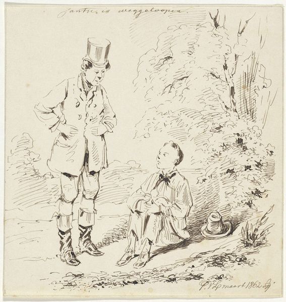 Editor: Right, next up we have a piece from Adrie Vürtheim called "Man en kinderen op een bospad", or "Man and Children on a Forest Path." It’s an ink and paper drawing that could have been made anywhere between 1917 and 1970. The overall feeling I get is one of quiet domesticity, like a snapshot of everyday life. What strikes you most about this work? Curator: That feeling of quietude is spot on! I wonder, though, is it *too* quiet? There's something almost theatrical about the scene, don't you think? The figures are posed so deliberately amongst the trees which loom like silent observers in a play. Notice how the crisp lines of their clothing contrast against the wilder textures of the woods – it’s like civilization politely encroaching on nature’s stage. The birdhouses…do they offer solace, perhaps, or suggest constraint? Does the image bring to mind a fable, perhaps slightly dark around the edges? Editor: Fable-esque, definitely! It’s those birdhouses – so many, so close. Curator: Indeed, almost aggressively picturesque! I imagine Vürtheim chuckled to herself. All this sweetness… yet, observe how carefully she delineated each line, how sharply she defined the figures… Almost as if challenging our saccharine assumptions, right? She draws you in with warmth and family, but the pen is wielded with precision. A world that’s safe, or one about to be subtly, permanently, rearranged? Editor: It’s like a dark fairytale – superficially pleasant, but with underlying tension. I wouldn't have seen that on my own. Thanks! Curator: And thank you, my friend, for giving my imagination a reason to dance amongst the trees. Every artwork becomes a fresh narrative, and yours brings light.