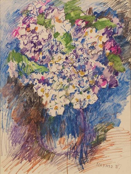 Curator: Look at this delightful "Untitled" watercolor and print by Matt Phillips, created in 1961. What's your initial reaction to it? Editor: It feels intimate and a bit melancholy. The soft, muted colors evoke a sense of nostalgia, like a memory of a once vibrant bouquet now gently fading. Curator: The flowers do appear to be past their prime. Considering the early 1960s context, one could read this work as a subtle commentary on domesticity and perhaps the fading ideals of post-war American life. Flowers, traditionally symbols of beauty and flourishing, are presented here with a hint of transience. Editor: The use of the vase is fascinating, though. Pink often symbolizes tenderness and affection, but it also evokes ideas around stereotypical feminine traits, doesn't it? Placed centrally in this piece, it acts almost as a vessel holding these broader conversations together. Curator: Absolutely. And I'd add that this particular pink resonates differently knowing the historical weight of gendered representation. The swift brushstrokes could imply an urgency, reflecting the era's anxieties and evolving societal expectations around women and their roles. Editor: The overall composition is key as well. The printmaking process, along with watercolors, brings a texture to the still life genre itself—more accessible than oils but certainly evoking familiar emotions for anyone recalling personal memories triggered by objects arranged in particular places in the home. It's so delicate that the choice of material brings with it an almost visceral response for the viewer. Curator: Precisely. Phillips, in his "Untitled" print, captures not just a still life, but a poignant snapshot of a culture on the cusp of dramatic change, symbolized through a common, universally recognizable arrangement. Editor: It certainly stays with you; the way that familiar imagery continues to shift under scrutiny offers space for broader thinking about the world around us.
