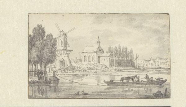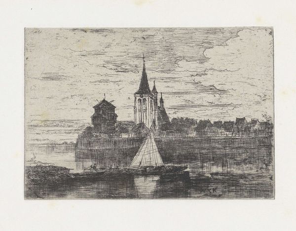 Curator: This etching, titled "Gezicht op het stadsdeel Wyck te Maastricht," was created by Alexander Schaepkens around 1840. The Rijksmuseum houses this little treasure. Editor: Oh, it’s diminutive but mighty. My first thought is: a peaceful melancholy. The delicate lines create a muted world, almost dreamlike, don’t you think? Curator: Absolutely. The softness comes from the etching technique itself. He’s capturing Wyck, a district in Maastricht, with an almost photographic realism but still imbues it with personal feeling. Editor: But isn't there something subtly political at play here? I mean, landscapes and cityscapes were rarely just passive depictions of pretty scenes, right? Considering the period, early 19th century, the rise of industrialization… Does it speak to that at all, this idealized vision? Curator: That's an intriguing point. We know Maastricht had a complex history, including being a contested city. While it lacks overt industrial imagery, the stillness may hint at a desire for stability. The sailing boat gently gliding and old buildings show trade, travel and history peacefully together. Editor: The church dominating the skyline adds a certain… weight, doesn’t it? It is also important to remember that the 1840s were also the start of photography, a challenge to art at that time, could that have had an effect here? Curator: Definitely. And Schaepkens must have felt it. The meticulous rendering of details like roof tiles and reflections in the water demonstrate the traditional craftsmanship. It asserts value in hand-created art. Editor: So, it’s both nostalgic and perhaps a quiet act of artistic preservation, asserting a particular version of place in a time of fast change. The simplicity lets us glimpse its world and reflect. A reminder of how time shifts our perceptions and landscapes. Curator: Indeed. I am happy to reflect that every work has its own time line and connection. And just like our memories that constantly change the context in our minds.