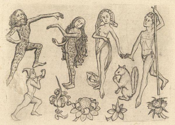 Curator: This ink drawing, attributed to Leonard Schenk and created sometime between 1710 and 1767, is titled "Studies van putti, nimfen en stroomgoden." It's part of the Rijksmuseum's collection. It feels wonderfully chaotic, doesn't it? All these figures tumbling about the page. Editor: It certainly does. A whirlwind of classical allusions! The loose lines give it a sense of movement, almost like catching a glimpse into a dream. It seems preliminary, like notes taken for a larger composition, a stage design, perhaps? Curator: Precisely. We are likely seeing an allegorical study here, steeped in Baroque sensibilities. Sketches like this functioned as visual notebooks of a kind, a record of the visual and intellectual resources available for deployment by artists during this era. Editor: And those figures! The putti with their baskets of flowers suggest abundance, celebration... perhaps love? And the river gods, languidly reclining, represent the life-giving force of water. These are archetypal figures that resonate deeply in Western art. They're not merely decorative; they're carriers of cultural meaning. Curator: Indeed, and we see echoes of those figures reappearing across various commissions for decades afterward, particularly across different countries and courts that adopted French artistic theories of the era. The study's very accessibility likely also increased their reproduction in other formats for other artists and buyers. Editor: There's something inherently timeless in their depiction as well. They’re rendered in a way that evokes emotion rather than specific detail, which means their emotional relevance translates over the generations, which in turn impacts on their meaning and usage. Curator: Ultimately, such loose sheets provided more fluid ideas about political and religious representation, which then provided new ways of seeing things that ultimately helped solidify socio-political status. Editor: Absolutely. And it really underscores the value of understanding the symbolic vocabulary of art to connect with our own cultural past. Curator: Exactly. I'm left considering what impact artworks like this, that were very widely disseminated at the time, ultimately have on how we, even now, visualize some of these characters and themes. Editor: Yes. The persistent visual memory these images created shapes how we perceive, interpret, and even dream today.