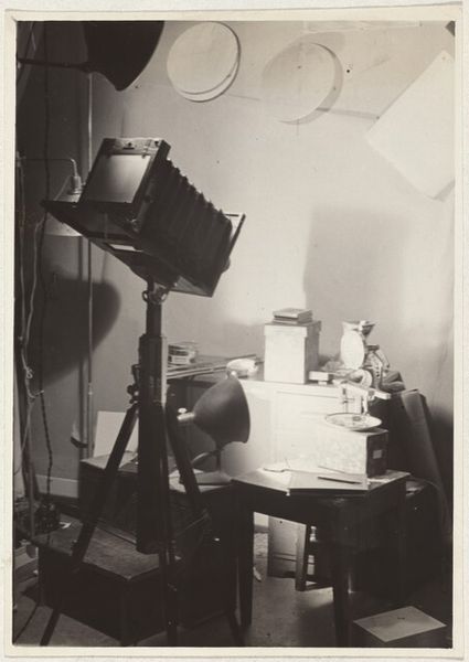 Editor: This is an advertising photograph from sometime between 1910 and 1920, made by the photographer Simons. It shows a woman reading, bathed in dramatic light, surrounded by what looks like an artist’s studio. The whole scene has an elegant, almost dreamlike quality. I’m curious about that stark light; it feels so modern and a little theatrical for the period. What catches your eye in this image? Curator: You're right, there’s something enchanting and slightly unsettling about it. It feels as if we are witnessing an intimate, yet staged, moment. The light, especially, pulls me in. It's so interesting that the artist spotlight itself is included in the frame! It feels so incredibly meta—almost as if Simons is winking at the viewer, making it obvious it's constructed, like theatre. Editor: Ah, interesting point! Do you think the reference to Japonisme might come in from this, a reference to theatrical sets? Curator: Yes, that makes a lot of sense, particularly given the asymmetrical composition and flattened perspective reminiscent of Japanese prints! I find myself wondering if this picture hints at how much technology influences our perception of art, or if it's about celebrating a moment in a more deliberate manner than you could, without modern studio equipment. Editor: So, is Simons really just selling the *idea* of artistry as much as their photographic skills and equipment? Curator: Precisely! By revealing the technical apparatus, the picture becomes as much about how a photographic image is constructed as it is about that solitary woman and her book. It’s a lovely interplay. What I found intriguing upon a second view, is what it whispers about our ongoing negotiation of artifice, something we, as a culture, constantly strive to find and unveil. Editor: I see! So the photograph itself, then, prompts one to be more self-aware! Thanks. That’s really fascinating. Curator: A photograph encouraging deeper consideration—how perfectly apt!