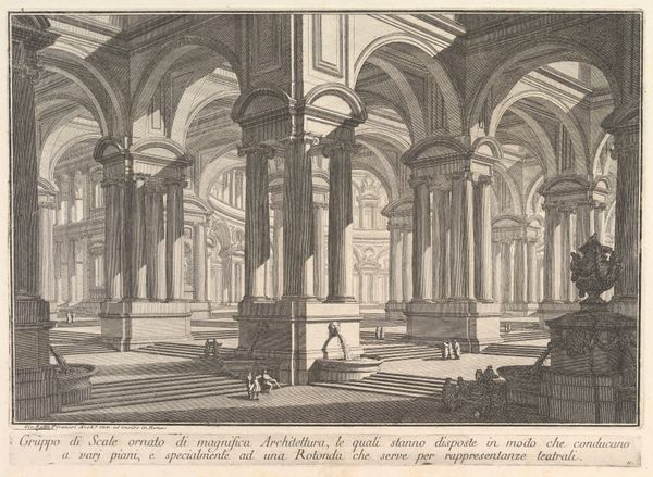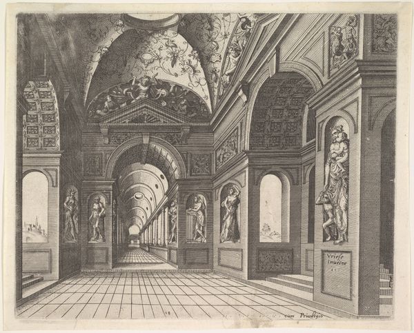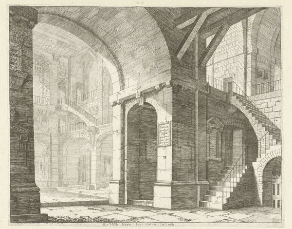 Curator: Looking at Julius Milheuser's 1635 print, "Kerkinterieur," what's your initial reaction to this rendering of a church interior? Editor: It’s immediately striking, isn't it? The starkness, the near clinical detail rendered through engraving. I'm curious about the availability and preparation of materials during that period. The sheer labor to achieve this! Curator: Precisely! Think about the socio-political context, the church's power and influence in 17th century society, particularly over artists who depended on their patronage. Did their faith genuinely inspire them or were these commissions driven more by market demands? Editor: An important question. Given the level of detail, from the textured stone to the carefully rendered figures, there was an intense awareness of the materials. The different tones, and shadows – a complete control of production! And how does the perspective play into perceptions of religious institutions? Curator: The dramatic use of perspective emphasizes the church's grandeur, certainly. But it also draws the eye upward, reinforcing established religious hierarchies. There's something to be said about the interplay of sacred space and control here. Editor: Absolutely. This piece gives us such insight into baroque architecture, revealing an efficient machine made of organized labor, where printmaking serves the institution, replicating images across communities that expand through the markets that the artist helped produce. The very texture seems like a tangible assertion of church dominance, of the time taken for even such simple image distribution! Curator: What truly interests me are the anonymous figures within the interior— the praying man, the observer… Are these mere adornments to emphasize scale and piety, or were they carefully planned inclusions to project certain ideals within baroque cultural politics? How are individual beliefs shaped or challenged by the institution? Editor: Right, because print was already impacting culture deeply at the time. Thinking about this, though, the level of planning required indicates something deeply intentional about its mass appeal... a sort of brand identity. The labor investment in creating an aura. Curator: Well said! By examining the artist, date and materials, as well as looking at the political and societal impact, it enhances my own analysis. Editor: The exercise also demonstrates just how profoundly art creation depended on materiality and markets as essential tools to broadcast identity.